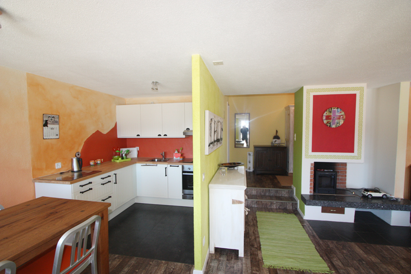 EG: Eingangsbereich mit Garderobe, Korridor, Wohn- Schlaf-Essraum mit Cheminée und Ausgang zum überdachten Gartensitzplatz mit Grünfläche, Küche mit Essplatz, Badezimmer mit Wanne / Lavabo / WC in Erstausstattung. Mit wenig Aufwand könnte ein kleines separates Zimmer realisiert werden. Allgemeine Waschküche mit Waschmaschine und Tumbler, separater Boiler für diese Wohnung, Kellerabteil für Sportgeräte, Vorräte mit Stromanschluss für Gefriertruhe etc. sehr praktisch, da auf gleicher Etage.