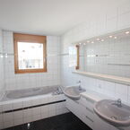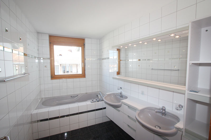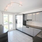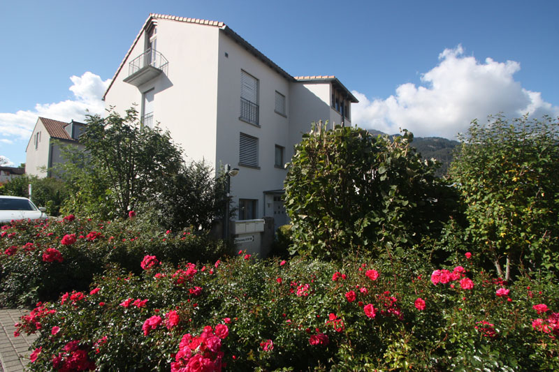 Bj. 1994, modern, hell, sonnig, Wohnfläche netto ca. 140 m2, Nutzfläche ca. 180 m2, in kleinem 3-Familienhaus, grosser und überdachter Balkon, Cheminée, eigenes Treppenhaus sowie eigener Untergeschossbereich mit Keller; Waschküche mit Waschmaschine-Tumbler und Getränkeraum. Fussbodenheizung. Allgemeiner Fahrrad-Roller-Raum und Kinderspielplatz inmitten der Siedlung.