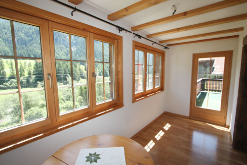 Haupteingang. Garderobe. Korridor. Küche. Esszimmer mit Ausgang zum Balkon sowie offener Durchgang zum Wohnbereich. Wohnzimmer mit Pellet-Cheminée-Ofen sowie Ausgang zum Eck-Balkon mit Berg- und Talblick.