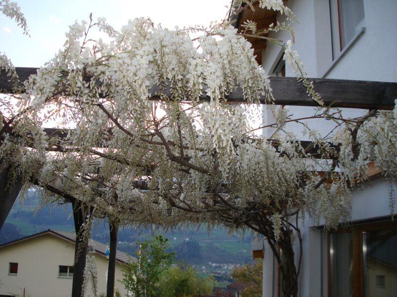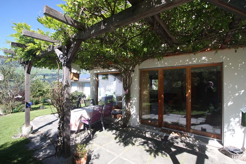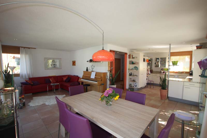 Eingangsbereich, Garderobe, Tages-WC/Lavabo/Dusche/Fenster, offene und helle Küche in Hufeisenform, Ausgang zur Pergola mit lauschigem Sitzplatz, Essplatz mit Eckfensteranlage, Wohnen mit Ausgang zum Süd-West-Sitzplatz mit tollem Bergblick.