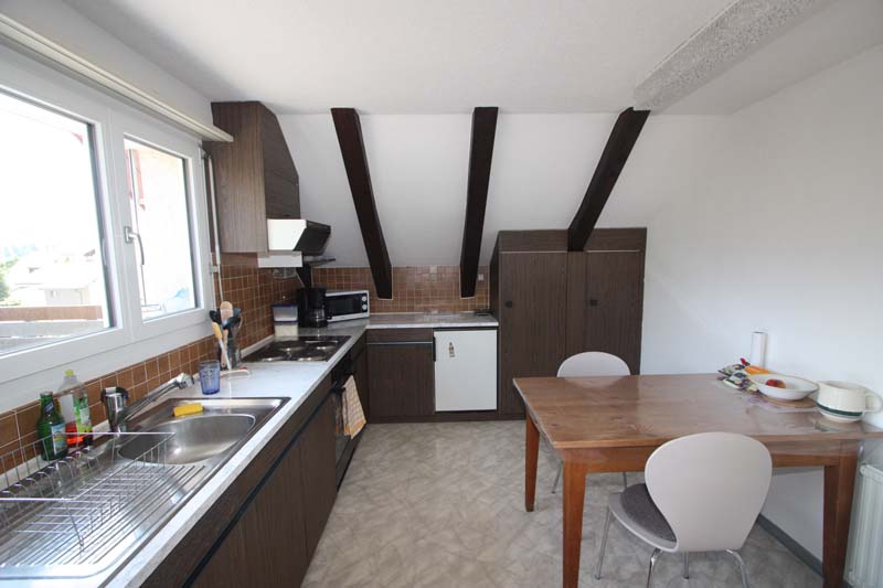 Grosse Küchenanlage mit Essplatz, leicht abgetrennt vom Wohnraum. Wohnzimmer mit Ausgang zur riesigen Dachterrasse, welche zum Verweilen oder Grillen einlädt und eine angenehme Aussicht mit relativ viel Privatsphäre bietet. Ein grösseres und ein kleineres Schlafzimmer. Neuwertiges Bad mit Lavabo/Wanne/WC und Fenster. Kleine und schwenkbare Duschwand vorhanden. Abstellraum auf dem Dachboden zur alleinigen Benützung. Im UG befindet sich ein eigener Kellerraum mit Erdboden und Kies belegt. Waschküche mit Trocknungsmöglichkeit zur allgemeinen Benützung.