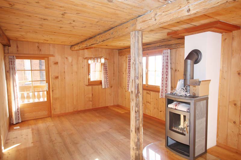 Küche mit Ausgang zum Balkon, Bauernstube mit Cheminée-Ofen, Schlafzimmer.
