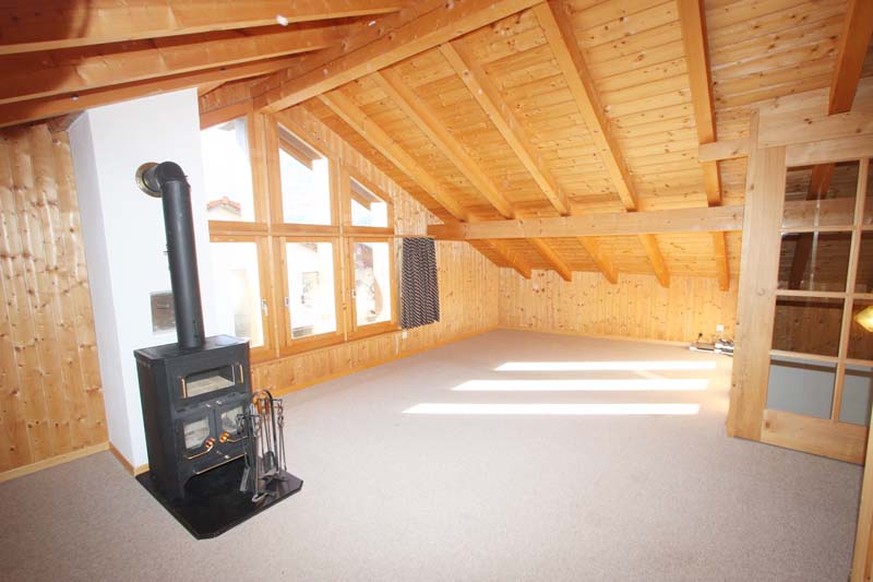 Grosser Raum als Wohnzimmer oder Schlafzimmer, Dusche/WC/Lavabo/ Handtuchradiator und Fenster. Abstellraum. Cheminée-Ofen.