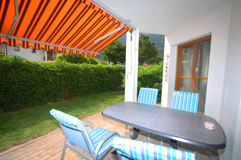 Eingangsbereich mit eingebautem Garderobeschrank, praktische Küchenanlage mit Blick ins Grüne, Essplatz, grosszügiger Wohnbereich mit Ausgang zum überdachten Gartensitzplatz mit Sonnenmarkise und grüner Sichtschutzhecke, Bad mit Wanne/WC/Lavabo/Fenster und Waschmaschine, helles Schlafzimmer mit direktem Ausgang zum Sitzplatz, ein weiteres Schlafzimmer (oder Arbeitsraum), pflegeleichte Bodenbeläge mit Keramik und Eichenparkett in Echtholz. Wohnung von aussen ebenerdig erreichbar ohne Treppen oder mit Lift über Tiefgarage.